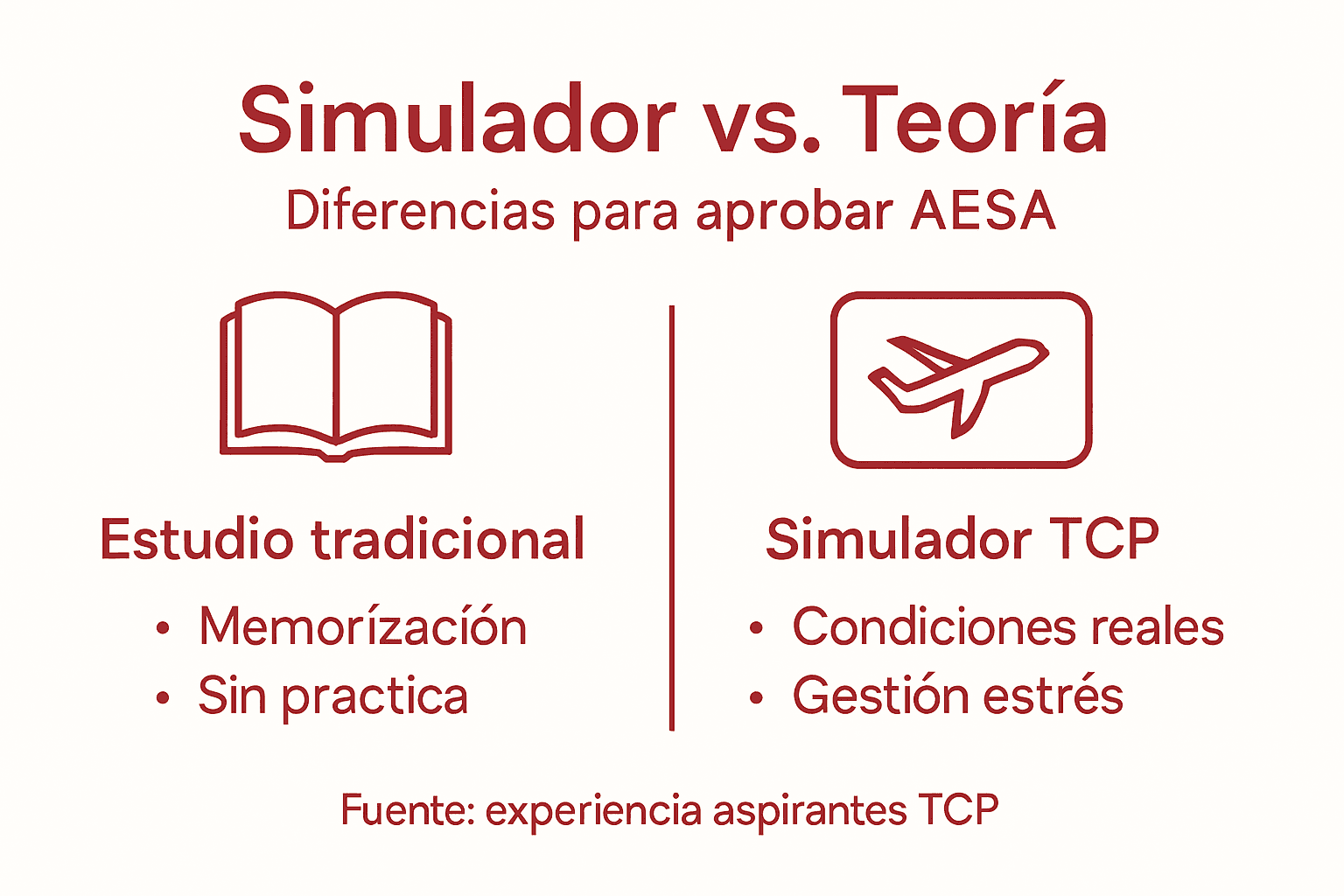 Consejo profesional: Utiliza simuladores como herramienta de preparación durante 8-10 semanas antes de tu examen oficial, pero ten claro que solo AESA puede certificar tus competencias legalmente.